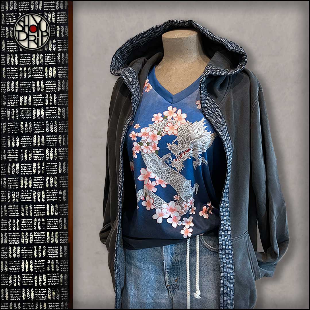 The Ajiro pattern resembles a woven basket and is one of the oldest traditional patterns of Japan. This indigo fabric imported from Japan, adds a dash of Japanese flavor to this charcoal Happi Hoodie. You'll love how great this piece feels when you slip it on!