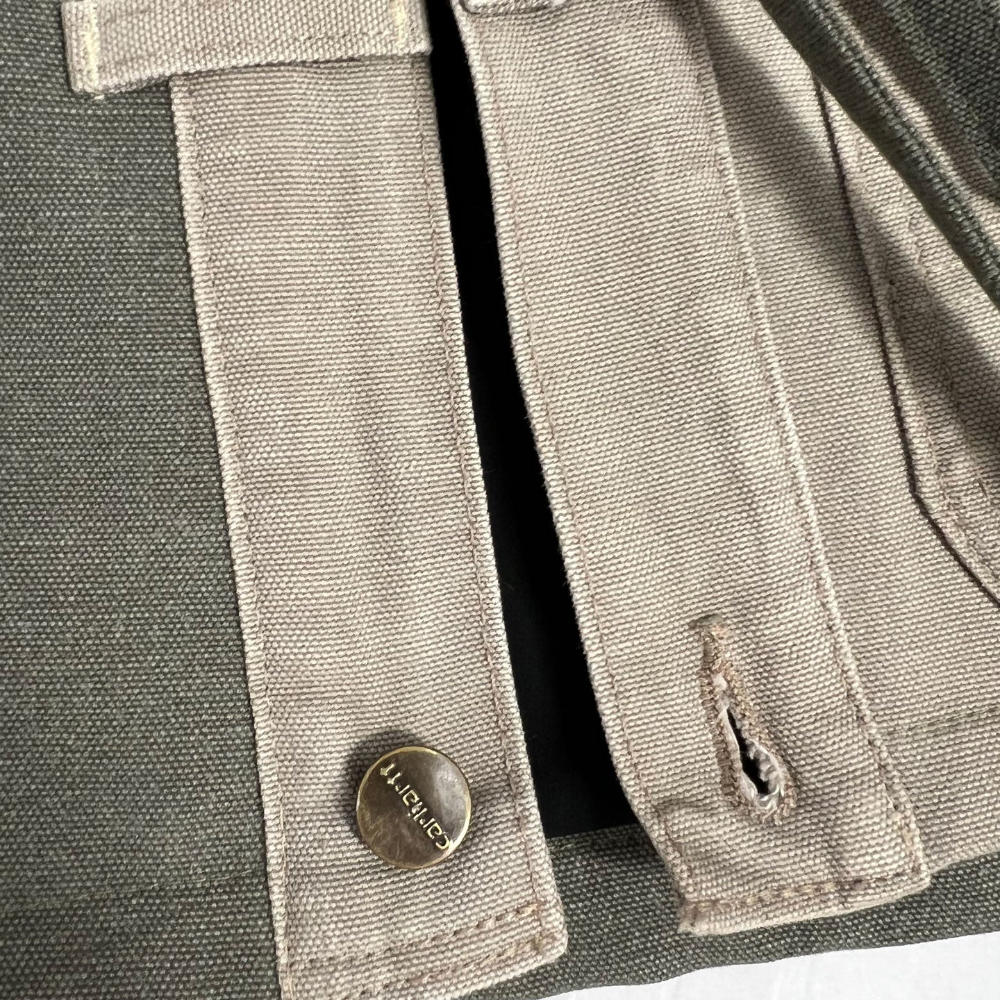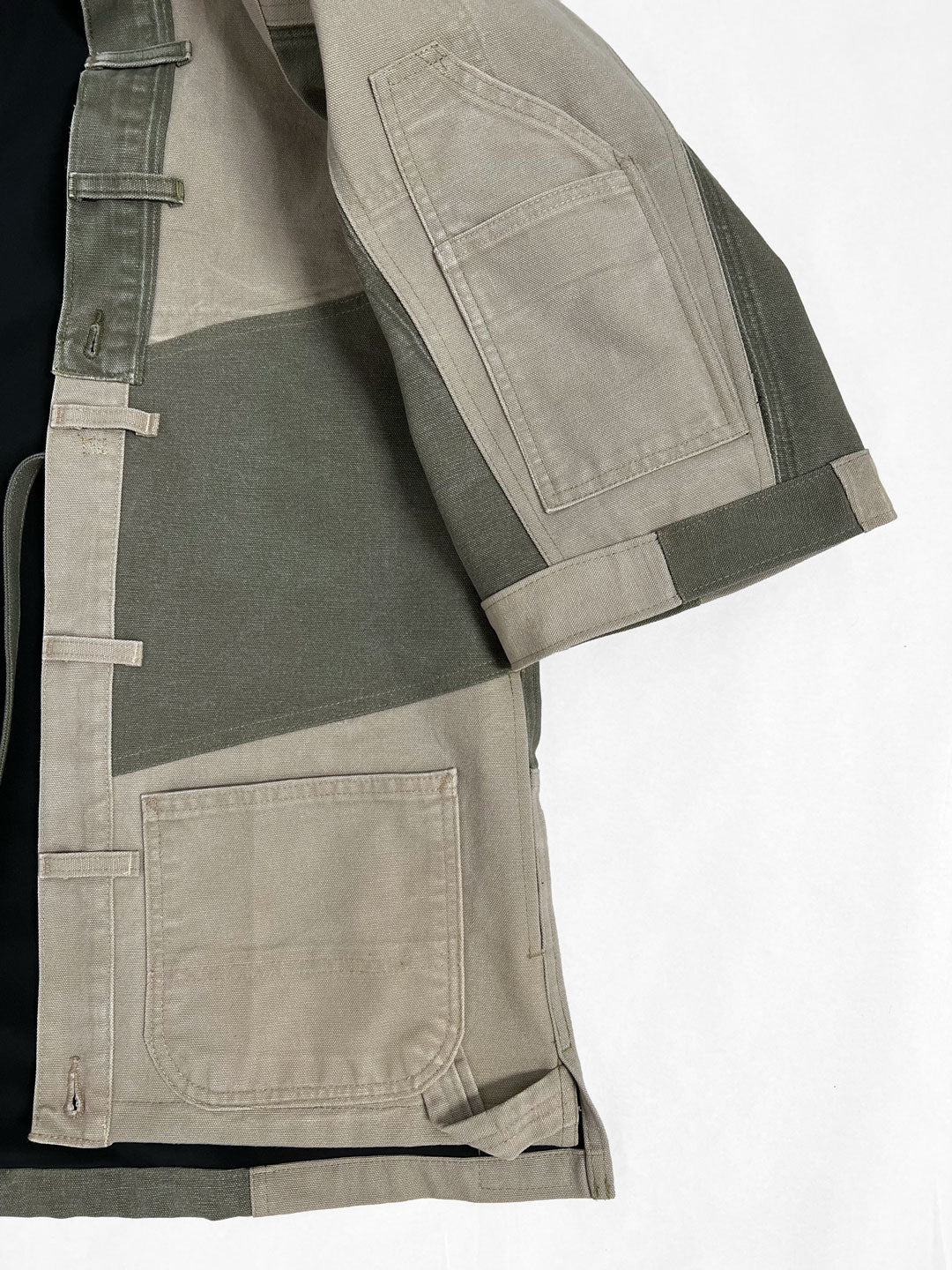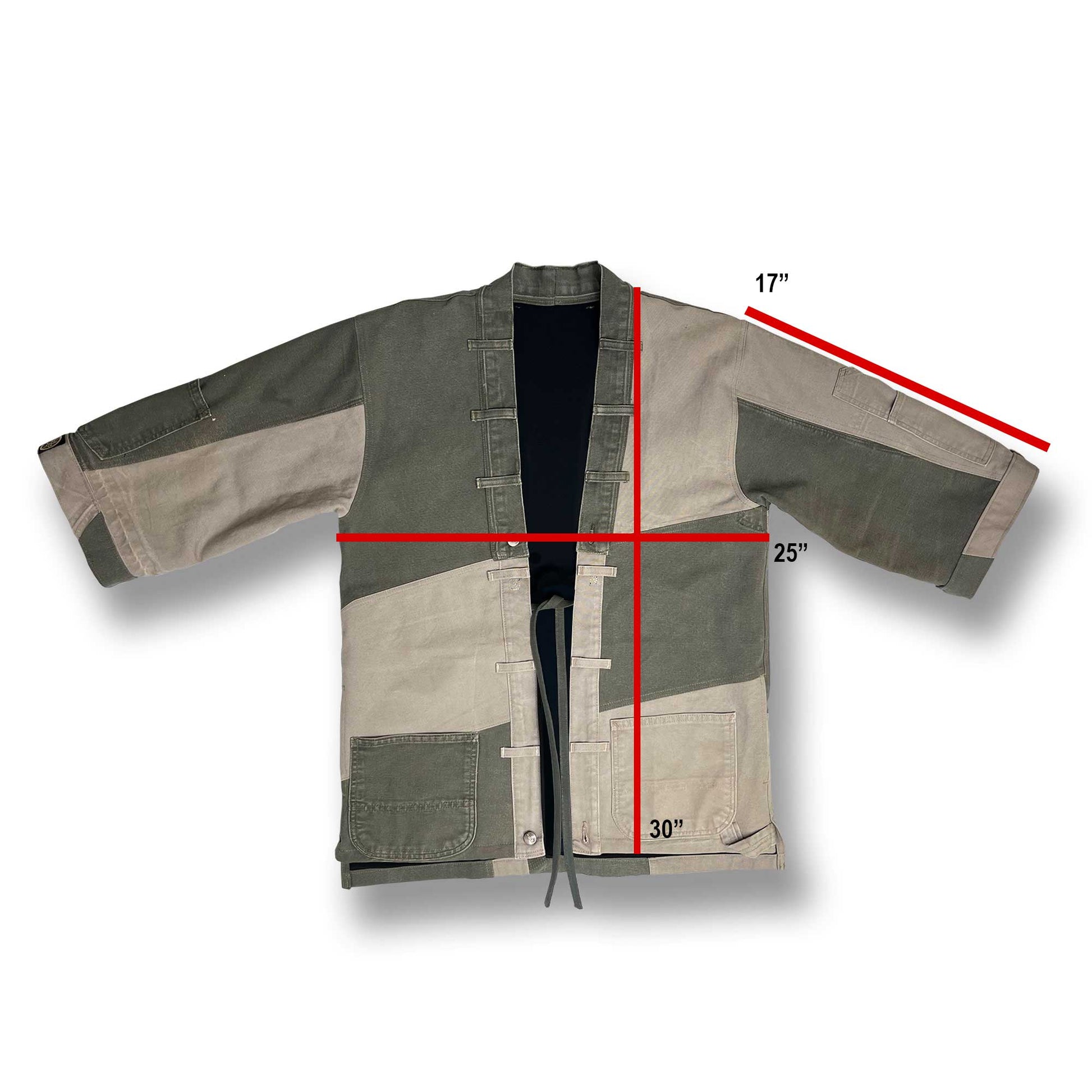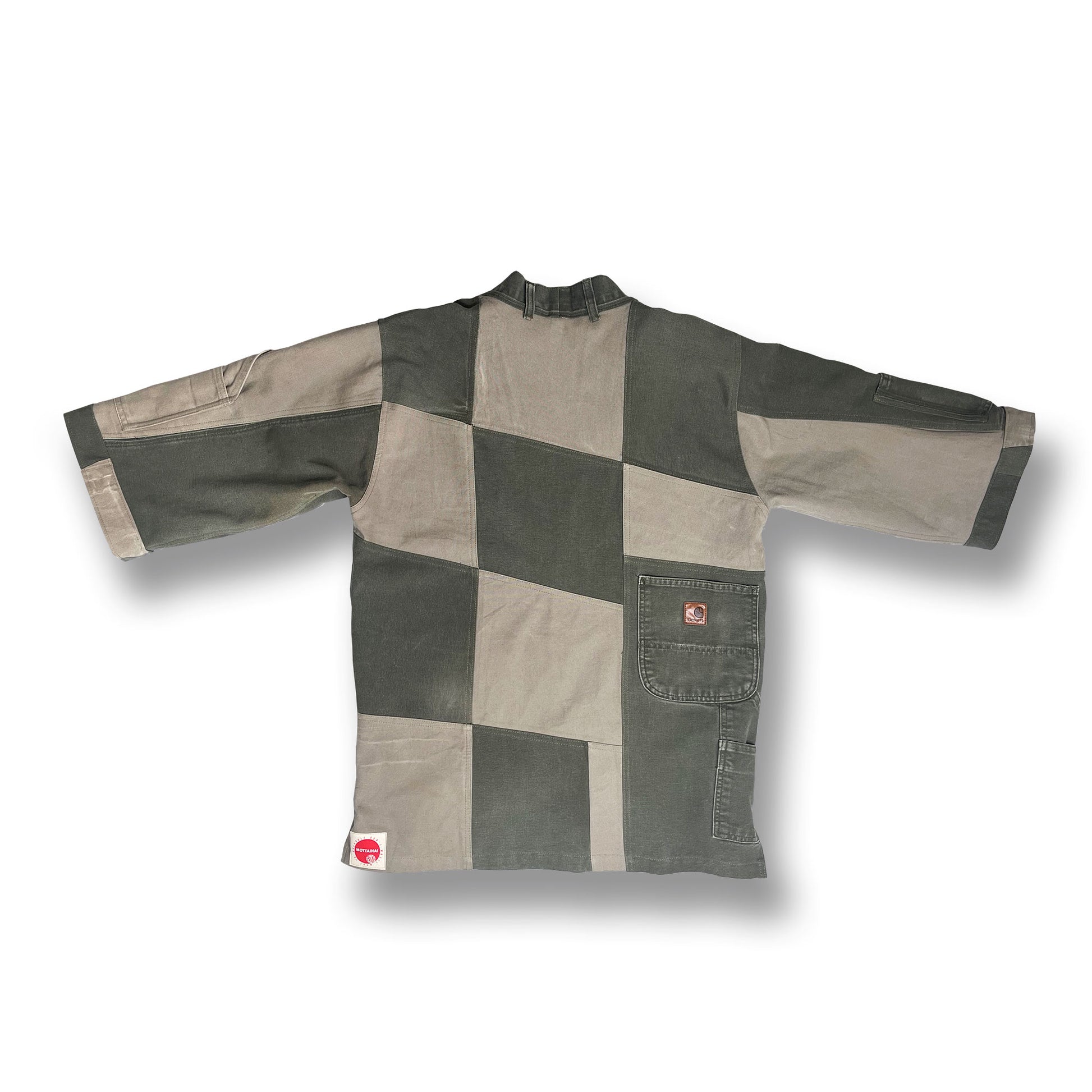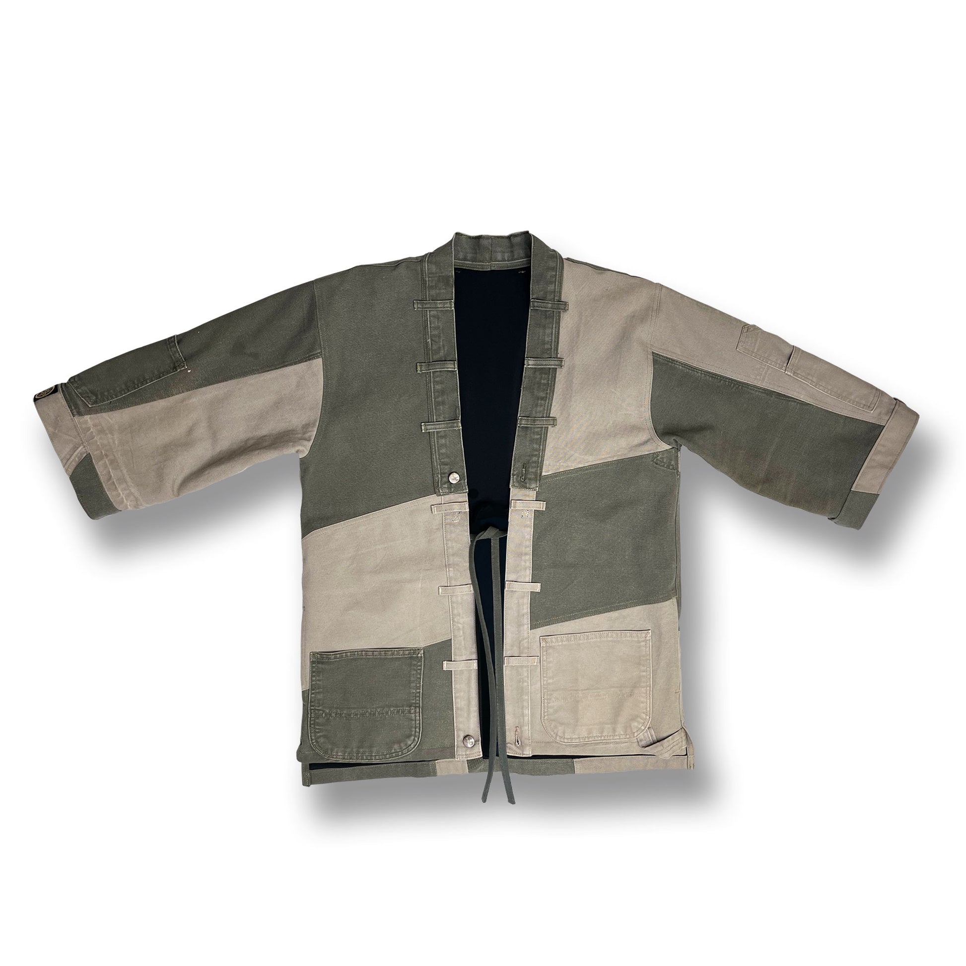 This One-of-a-kind Happi Coat was pieced together from two pairs of vintage Carharrt work pants. The asymmetrical design gives this Japanese style an urban edge. You'll delight in the details of this piece seeing the innovative way it has been pieced together. There is a weight, strength and durability about it that comes from its work pant roots. A unique piece that will fit any wardrobe and you can feel great about wearing.