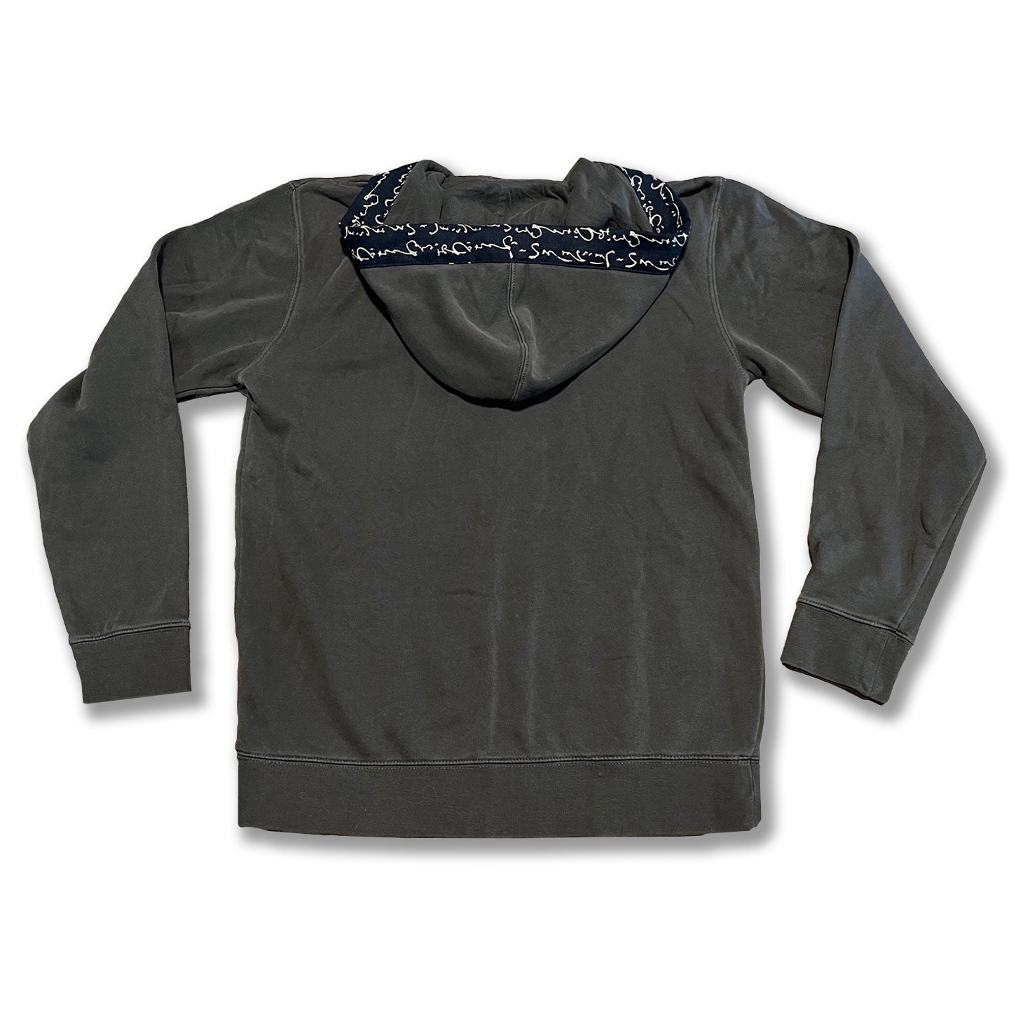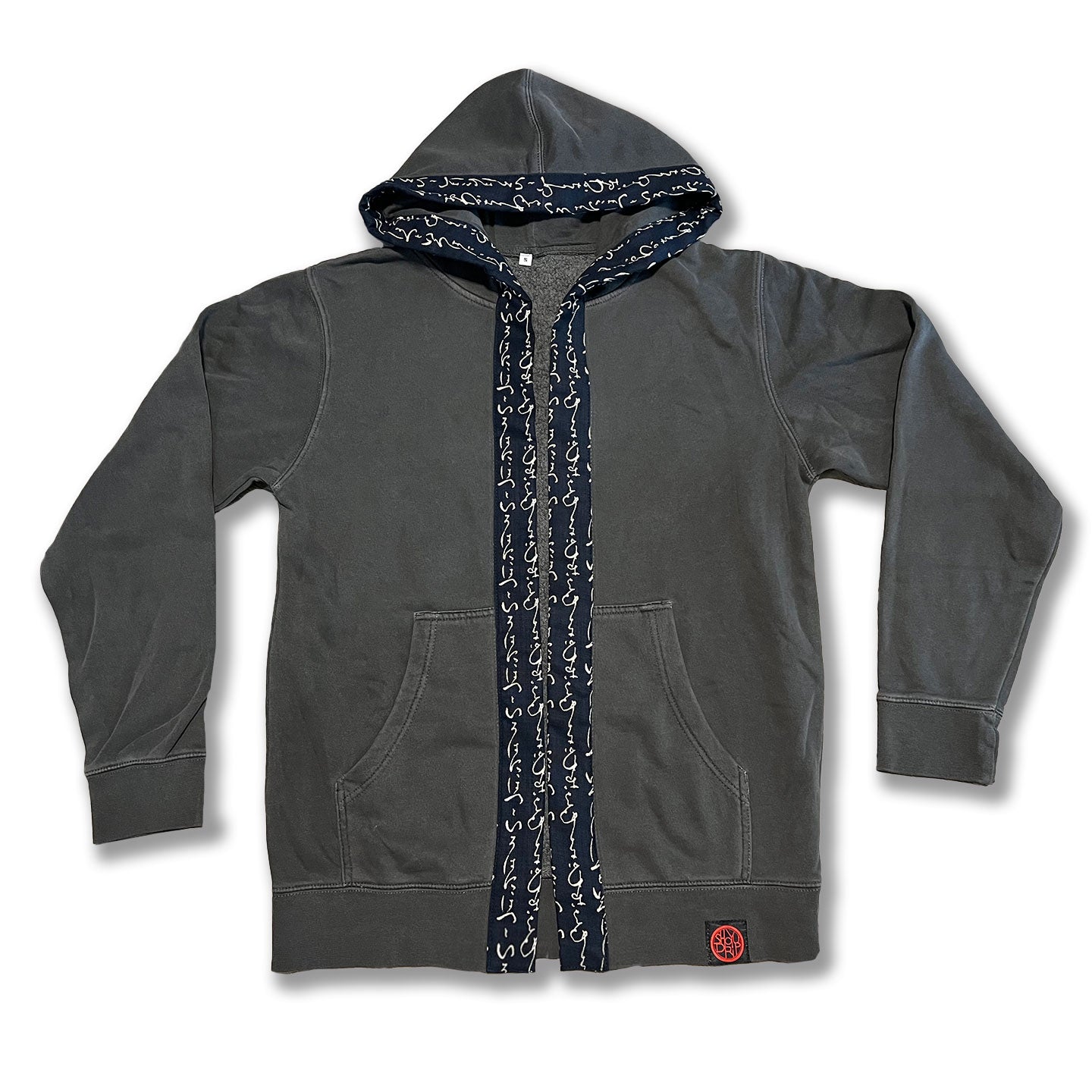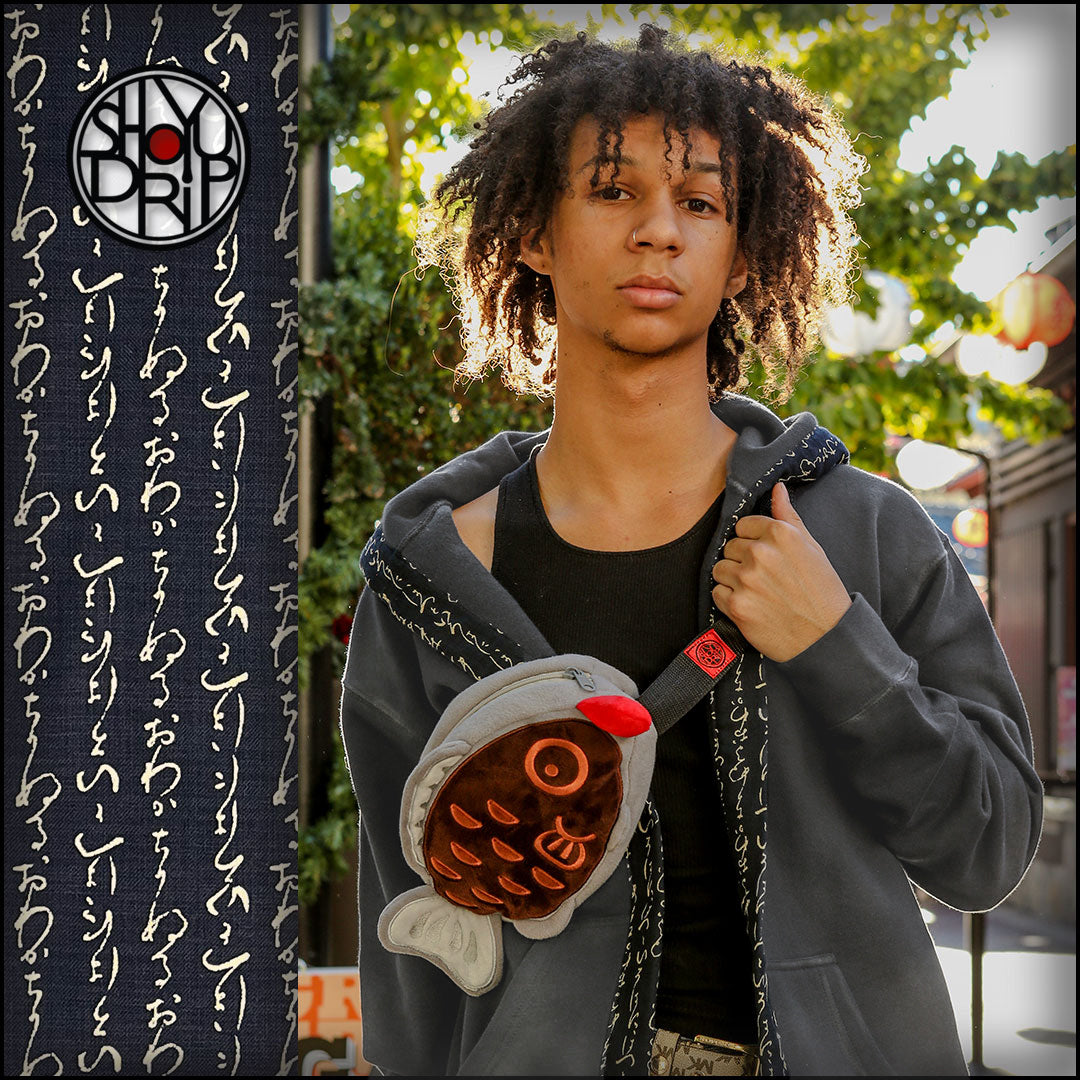 Lines from an ancient Japanese poem line this hoodie and add just a dash of Japanese flavor to this charcoal Happi Hoodie. The fabric is a traditional indigo with a wonderful texture to it. You'll love how great this piece feels when you slip it on!