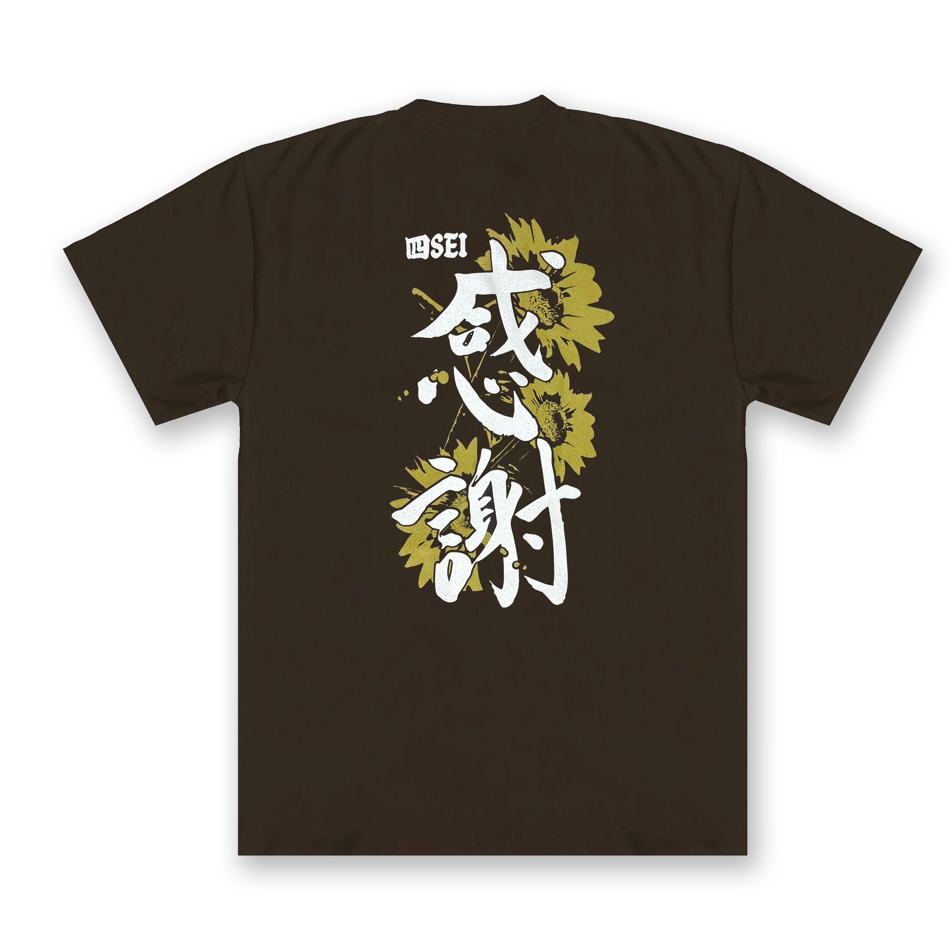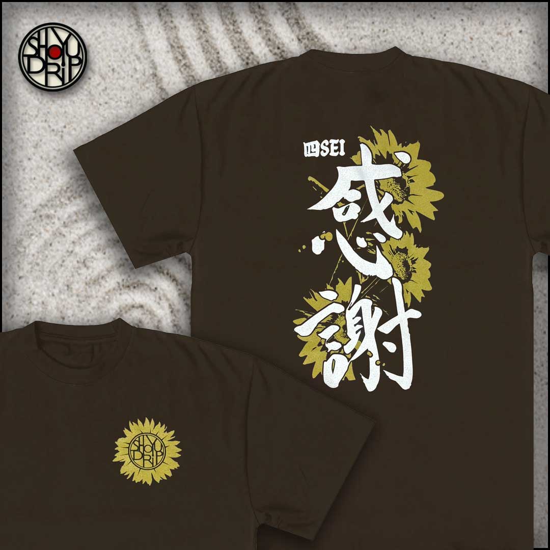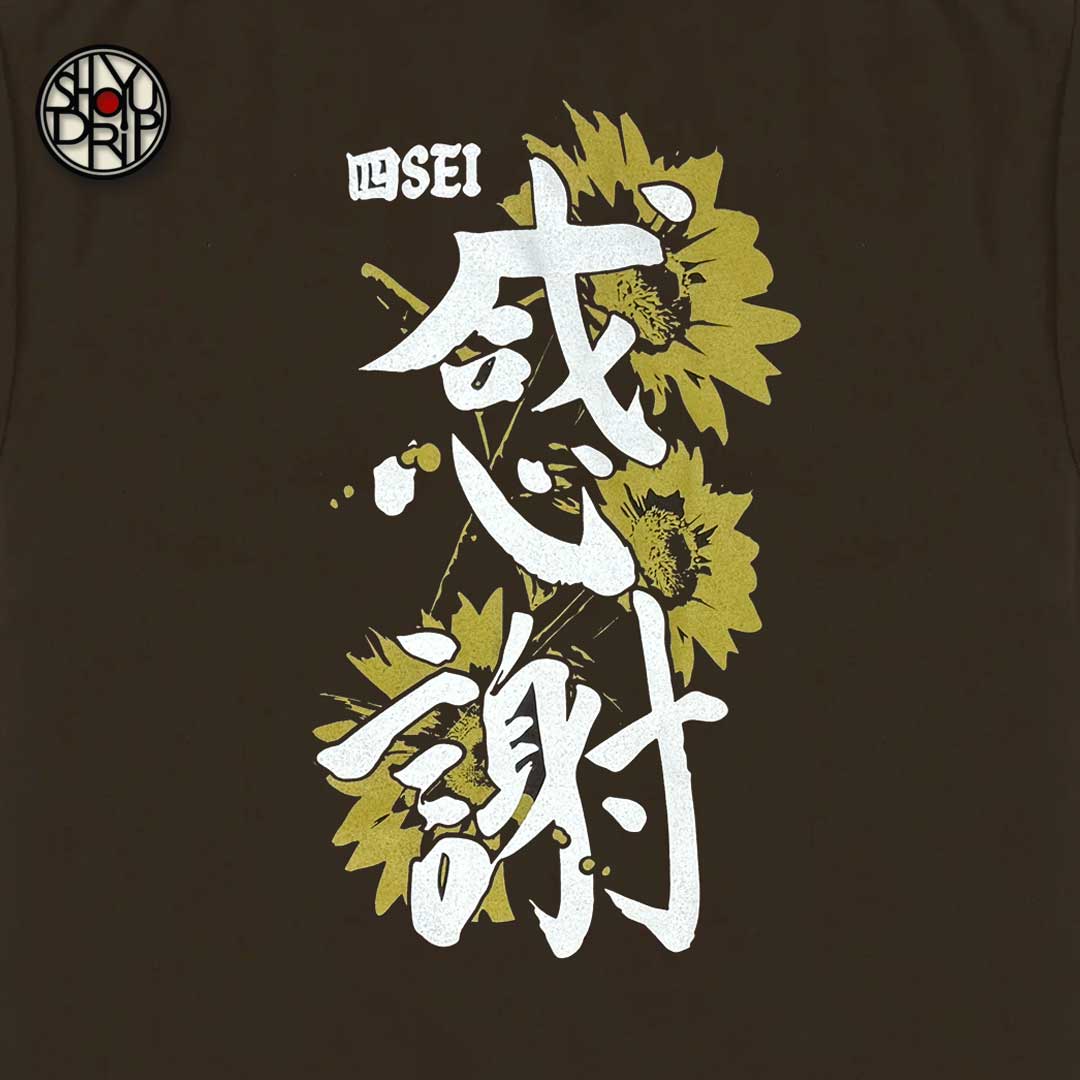 A tribute T-Shirt to the Yonsei generation, our fourth generation Japanese Americans. The kanji means "appreciation or gratitude". Kai Tsuyuki, the designer and yonsei, used the sunflower as a symbol to represent the gratitude his generation has for the ones that went before him.